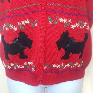 This vintage-inspired Alfred Dunner red sweater vest is the perfect cozy holiday piece! Featuring embroidered Scottie dogs, bows, and florals, it brings festive charm with a touch of nostalgic cottagecore. The six-button front and soft knit fabric make it a great layering piece for the holidays or year-round dog lover style
