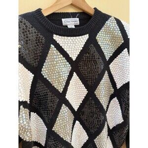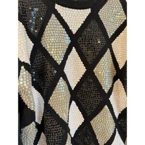 Vintage Alfred Dunner Sequin Sweater Diamond Patterns Black White XL