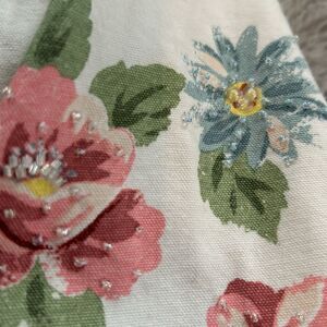 Vintage white denim jacket with floral print, highlighted with blingy beads on the flowers. Pockets, lightweight, perfect for spring or a transitional piece. elastic at the waist and cuffs for comfort.