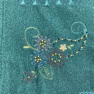 This vintage Alfred Dunner women's fleece jacket in size M features embroidered accents, making it a stylish and unique addition to your wardrobe. The jacket is made of polyester fleece, providing warmth and comfort. The green color and basic jacket style make it versatile for both casual and more dressed-up occasions. Perfect for adding a touch of retro charm to your outfit.