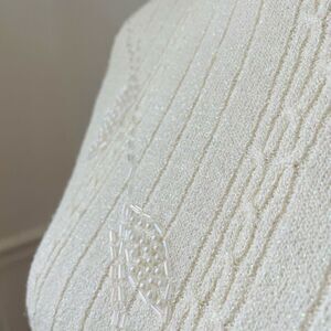 Vintage 80s Alfred Dunner lightweight knit sweater in ivory with a very subtle metallic green shimmer that is impossible to photograph. decorated with scrolling tonal beaded leaves. Mock neck. Acrylic, nylon and metallic thread blend. Made in macaw. Tag size medium petite. Laying flat measures 22.5 inches shoulder to him and 19 inches armpit to armpit. Shoulder pads for a structured look.