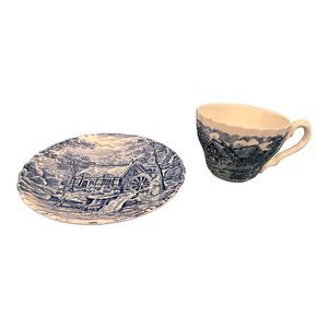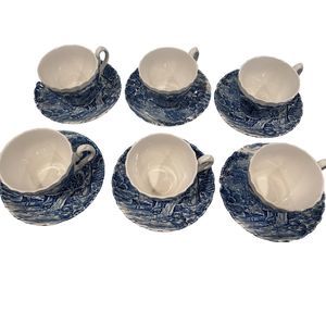Vintage Alfred Meakin Staffordshire "The Mill" Blue White Cups Saucers Set of 6