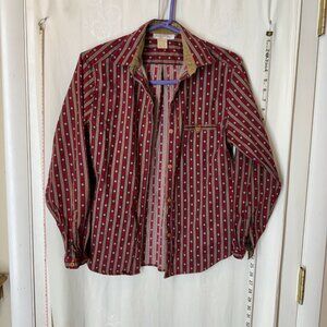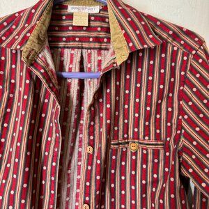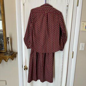 Vintage Alfred Sung / Sungsport Skirt Set. Top has great corduroy detail on the interior collar as well as front pocket and back loop. Skirt has pockets. Top is a size 6 - pit to pit - 18, back collar to hem - 25, skirt is a size 10, waist - 25, length - 28. Great pattern. 100% cotton, made in Hong Kong.