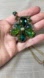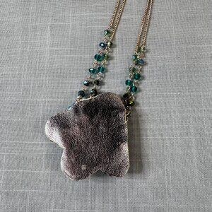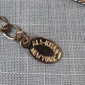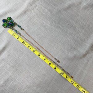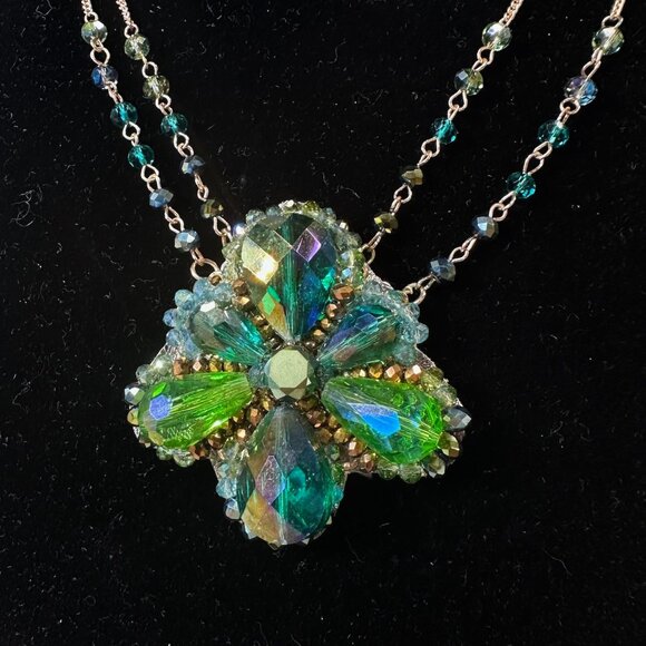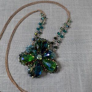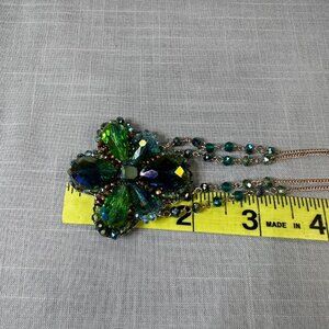 This gorgeous necklace is most likely from the 1980s and is signed on the tag "Ali Khan/ New York". The gold tone chain is almost a rose-gold color, with green and blue beads. The pendant is crafted from aurora borealis beads, backed with gold leather. In excellent condition, this super sparkly necklace has the most gorgeous color. I may just keep this one for myself! The pendant measures about 2" tall and wide, and the necklace is about 18"-21" long with an extra 3" extender chain. Simply stunning piece!