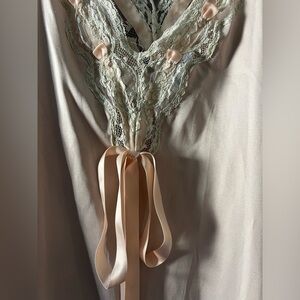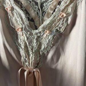 Beautiful vintage Alice Maloof nightgown slip dress, featuring soft satin fabric in a light blush ivory tone with romantic ivory lace trim. This full-length slip has a feminine deep V neckline, lace shoulder straps, and a ribbon bow accent at the bust. A timeless and elegant piece of vintage lingerie that works as nightwear, boudoir attire, or even as a styled slip dress for everyday cottagecore or bridal looks.