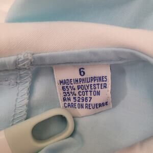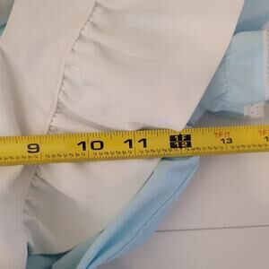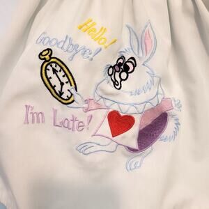 Adorable Alice in Wonderland costume dress in light blue with removable white apron. Features a Peter Pan collar, puff sleeves, back tie closure, and detailed embroidery of the White Rabbit saying "I'm Late!" Size 6. Buttons down the back and ties at the waist for adjustable fit. Lightweight and perfect for dress-up, Halloween, or Disneybounding.
