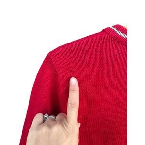 Get into the holiday spirit with this vintage All Points Christmas cardigan! The tight-knit ramie and cotton fabric features a solid pattern with metallic silver thread contrast trim on the collar and cuffs. The cardigan also boasts faux pearls, glass beaded covered buttons caps, and a snap closure for added style. Perfect for any occasion, whether it's a party, cocktail event, or just a casual day out. The cardigan comes in a size small and is designed with a loose relaxed fit. Hand wash only for optimal care. This sweater is perfect for the winter season and is sure to keep you cozy and warm. Excellent Condition- darker spot on back shoulder shown in picture