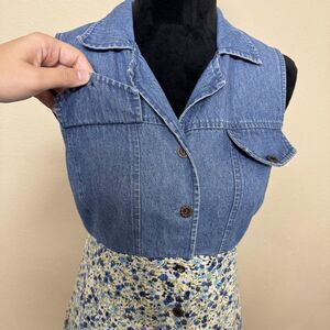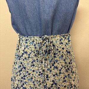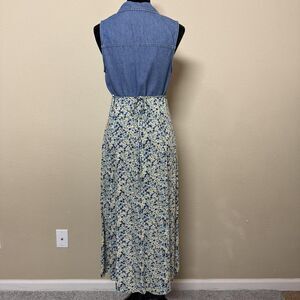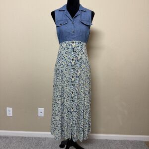 Item: Sleeveless mixed-media maxi dress with denim bodice and floral rayon skirt