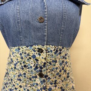 Design features: Collared denim bodice with button front; two flap chest pockets; full button-front floral skirt; tie-back waist; A-line silhouette; metal-style buttons on bodice and smaller buttons down skirt