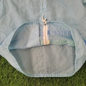 Vintage All-Wear Windbreaker Lightweight Jacket Large 22x27 Light Blue Yellow Two Tone Racer Stripe USA Made Ripstop Taffeta Nylon 80s 90s Hidden Zip Hoodie Raglan Sleeve Colorblock Stripes Talon Zipper
