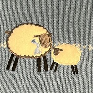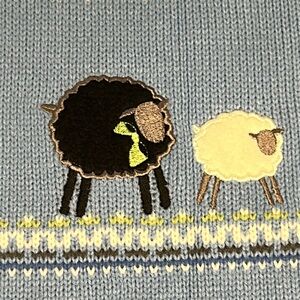 Cute sheep appliqués and embroidery. One black sheep! Silver zipper and pull.