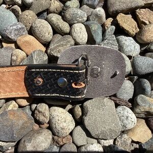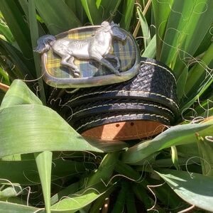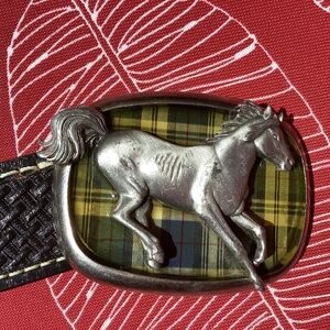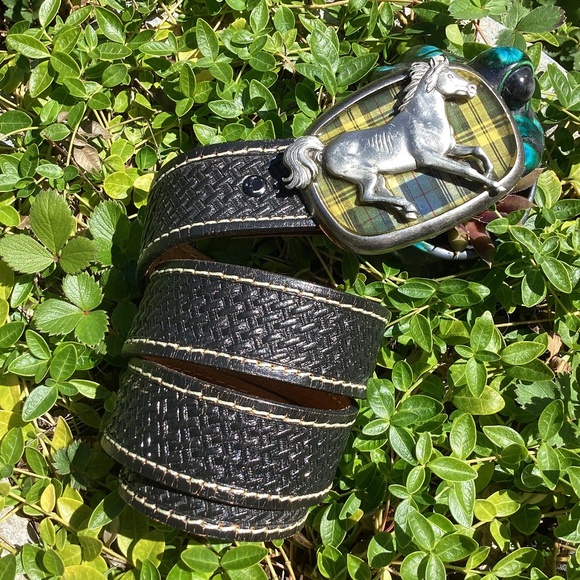 Super cool vintage Allison Daniel Designs running horse belt buckle on a black leather tooled belt. The buckle is a strong metal with a mixed color plaid design in the background said to be brass and resin. Great detail on the horse with the forelock, mane, tail and motion. The buckle appears to have the numbers 719 on the back. Good vintage condition with normal age wear. The belt is marked 4072 MALLORY 38. Five original belt holes with 3 extra added. No belt keeper. The buckle is attached to the belt with snaps so it can be removed and added to another belt of your choice if desired. ( one of the belt snaps appears to be missing its head. See photos). The buckle measures approximately 3.5 inches by 2.5 inches. The belt is 39.5 inches from end to end with the holes in the 31-36 inches area. Very interesting and unique piece of custom artwork.