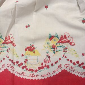 This vintage red and white apron is a charming nod to postwar homemaking, perfect for any tradwife or domestic goddess who loves a touch of nostalgia. Featuring a classic print of a bonneted woman with a pail, a yellow house, and a wishing well, it proudly displays the phrase “All’s Well That Ends Well.” The fabric has a soft, well-loved feel, with some yellowing on the front that adds to its authentic vintage character. Whether you're baking from scratch or simply embracing classic housewife elegance, this apron is a timeless kitchen staple.