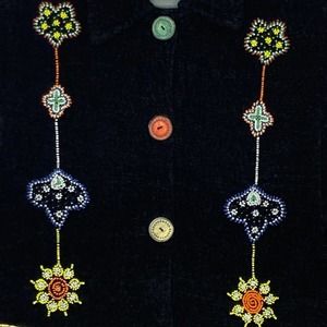 - This soft beaded and embroidered chenille topper jacket is in excellent pre-owned condition with exception of some loose stitching in some of the circles -- see green and red circles in the images after the tags.