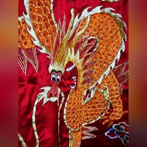 vintage silk dragon robe, embroidered Chinese kimono, Aloha Hawaii robe, statement lounge kimono, golden dragon embroidery, maximalist boho glam, red silk festival robe, Asian-inspired duster, collector's embroidered robe, bold loungewear aesthetic, opulent wearable art, witchy glam layering piece, dramatic soft dressing, vintage resortwear, retro silk dragon coat, art to wear