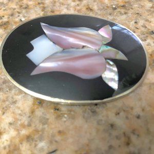 -This is a beautiful item that can be worn as a pendant or a brooch. It features an oversized light purple flower on a black background. Enamel and silver tone.
