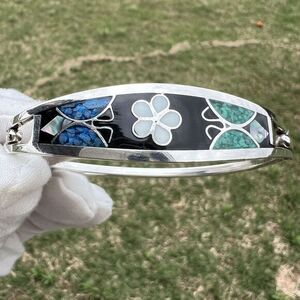 This is a vintage Alpaca Mexico women's bracelet made of abalone shell and enamel. The bracelet features a floral design with multicolor stones and is signed. It is made of silver tone Alpaca metal and has a bangle style. The bracelet is perfect for special occasions such as engagement, wedding, anniversary, birthday, Valentine's Day, graduation, Mother's Day, and Confirmation/Communion. It is an original piece from Mexico and is a great addition to any vintage or antique jewelry collection.