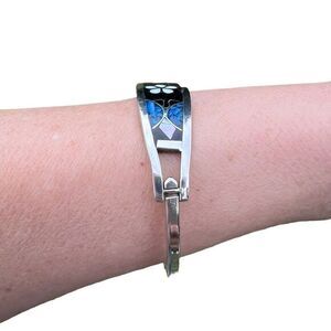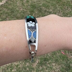 This is a vintage Alpaca Mexico women's bracelet made of abalone shell and enamel. The bracelet features a floral design with multicolor stones and is signed. It is made of silver tone Alpaca metal and has a bangle style. The bracelet is perfect for special occasions such as engagement, wedding, anniversary, birthday, Valentine's Day, graduation, Mother's Day, and Confirmation/Communion. It is an original piece from Mexico and is a great addition to any vintage or antique jewelry collection.