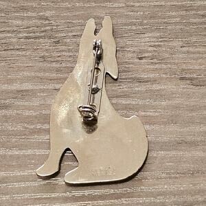 Unique Mexican Silver brooch features a wolf sitting in profile, howling at the moon. The silver body has etched details on the tail, face and paws and then abalone is inlaid on the main part of its body. Stamped Alpaca Mexico on the back.