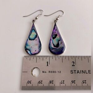 These beautiful Tear Drop Dangle Earrings are made with Abalone and Alpaca Silver. Alpaca Silver is a metal alloy of copper, nickel and sometimes zinc or iron. The silver is a shiny silver color that looks similar to stainless steel.