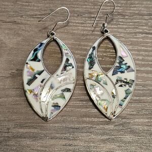 White enamel dangle earrings over Mexican Silver. Teardrop shaped with cut out. Inlaid with abalone. Stamped Alpaca Mexico.