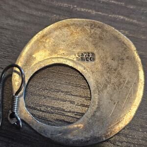 Mexican silver earrings with a layer of crushed turquoise. Large hoops with a cutout in the middle.