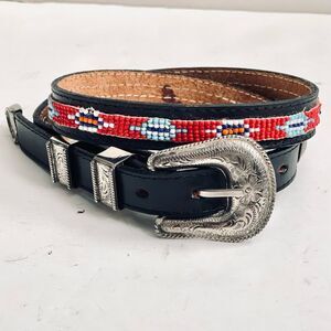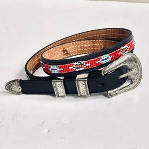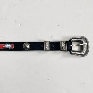 Stylish black leather belt with intricate silver buckle, belt stays and conchos. Hand beaded in Mexico with red and blue accents.