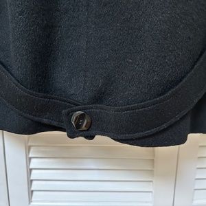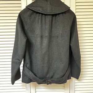 Alpaca and wool blend hip length jacket. Has the warmth of a short coat. Color is deep black. Peerless brand made in USA. Closes with 3 buttons in front. Belt with button for visual style in back. Excellent tailoring for a nice shape. Exterior in excellent condition. Interior lining in very good vintage condition. It is lightly frayed along the bottom, and the section near the arm holes has been repaired.