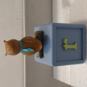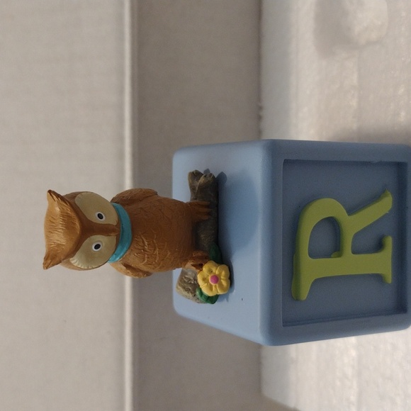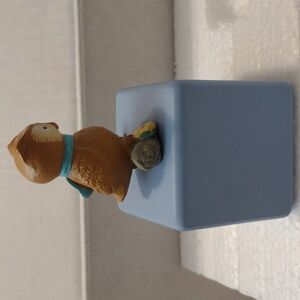 Delightful owl figure on a blue block, perfect for creative play. Features a brown owl with a blue scarf and a yellow flower accent. Encourages imaginative storytelling.