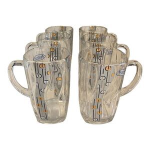 Elevate your tea drinking experience with this stunning set of six vintage Alpine Cuisine tea cups. The cups are crafted from high-quality glass and feature a beautiful geometric pattern in gold. Each cup has a diameter of 2.75" and a height of 3.75", making them perfect for hot or cold beverages.