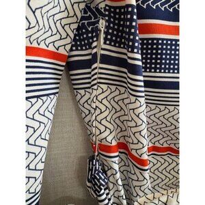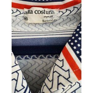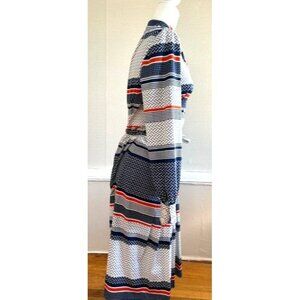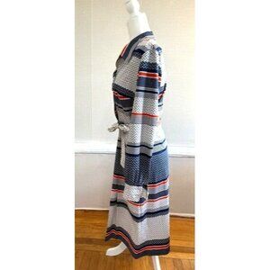 This gorgeous Alta Costura vintage long-sleeve collared midi/maxi dress features a bold striped pattern in navy, white, and red. Retro look. Made in Barcelona. Fabric tag is missing but possibly polyester. Size is listed as 46 EU and it fits a medium/large. Measurements included below. Excellent vintage condition. No rips or stains. Features include:
