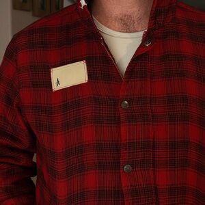 Stylish red plaid jacket with a hood. Features button closure and front pockets.