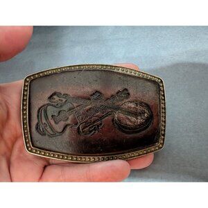 Rock your outfit with this rustic belt buckle featuring a banjo and guitar carving. It's a little worn, but that just adds character, right?
