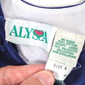 Vintage Alyssa beautiful navy blue velvet pinafore. Size 4, but looks to fit better as 2-3T. Please check the measurements provided.