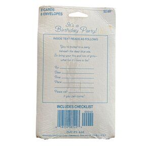 This themed set includes 8 invitations with envelopes, gift wrap, and 8 party bags. Ideal for coordinating a memorable under-the-sea celebration. Great vintage set!