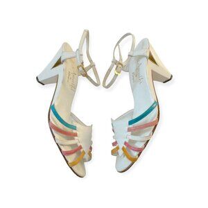 Vintage Amalfi by Rangoni White Leather Sandals | Multi-Color Straps | V-Cut Heels |Made in Italy