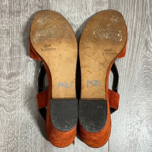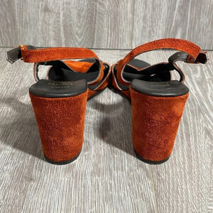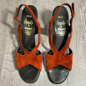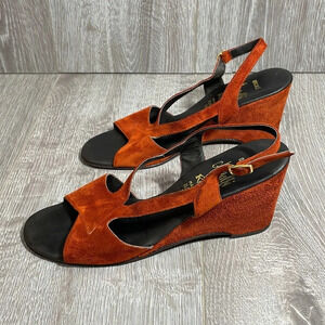 Vintage Amalfi by Rangoni Suede Leather Wedge Open Toe Sling Back Sandals in size 8.5 N. Excellent preowned vintage condition, last photo shows darker area on side strap of each shoe. Gold tone buckle, gorgeous rust orange color, made in Italy. Please see photos for approximate measurements and details. Item may show a difference in color based upon photography and perception. Photos are part of the description, as everyone’s level of condition may vary. From smoke free and pet free home. All packages are shipped the same or next business day.