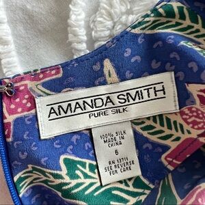Vintage Amanda Smith Blue 100% Silk Tropical Floral Print Colorful Sheath Dress