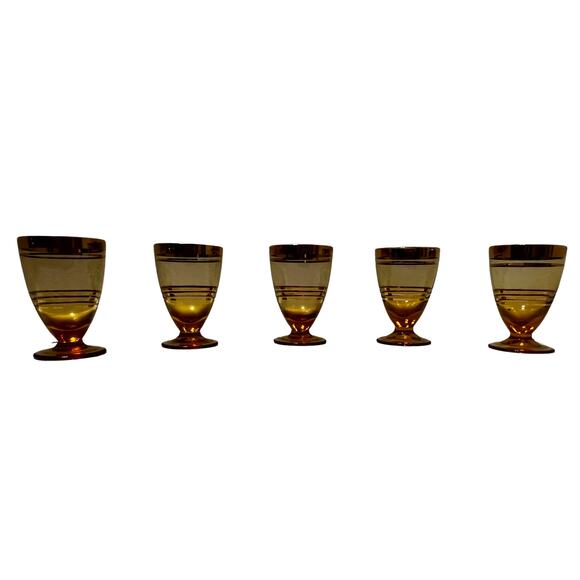 Vintage Amber Bohemian Shot Glasses With Gold Stripes Lot of 5 Glasses