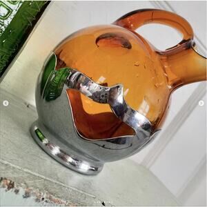 Vintage Amber Brown Glass Decanter Pitcher Silver Krome Kraft Barware Farber