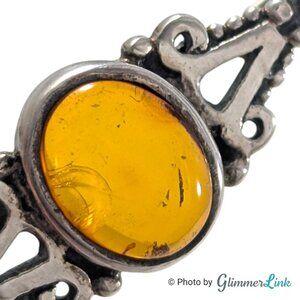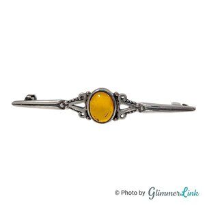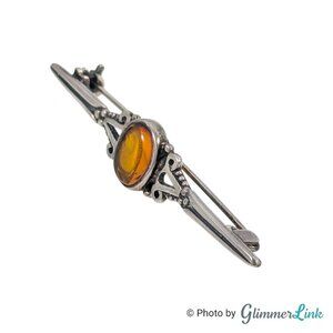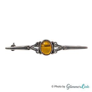 Vintage sterling silver bar brooch featuring an ornate slim design with a real amber cabochon stone at the center.
