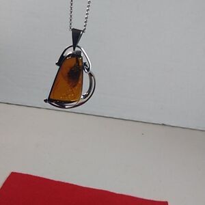 Designer Amber Cabochon and Silver Pendant and Chain
