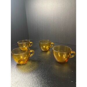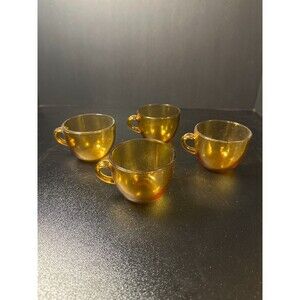 Set of 4 vintage amber depression glass cups, each about 2.5" tall. Classic warm amber color with simple handle design and smooth base. Lovely for display, vintage kitchen decor, or to complete a depression glass set.