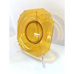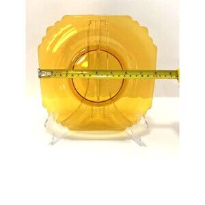 This product is a vintage amber glass square dinner plate from the Great Depression era, specifically manufactured in America in the 1920s. The plate features scalloped edges and a decorative pattern, with a glossy finish. It is a part of the Autumn product line by Diamond Glass and is hand-blown. The plate measures 8 inches in length and weighs 1 lb 10 oz. It is a single item and is suitable for all occasions. The plate is not antique but is a licensed reproduction of the original.