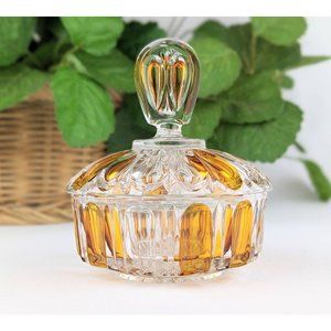 Stunning vintage dresser or vanity lidded clear cut crystal bowl with amber flash accents. The bowl measures approximately 4" in diameter and stands 1.75" tall without the lid. With the lid, the set stands 5" tall. The lid has a large handle and is also flashed with a matching orange hue. The glass bowl is in excellent vintage condition with very minor scuffing on the bottom of the bowl from tabletop contact. There is a very small chip on the bottom of the bowl that can barely be seen but can be felt with a fingertip. Gorgeous vintage accent piece. Bohemian crystal style. Gift worthy. Display worthy.