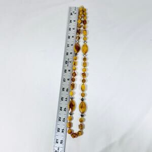 Introducing a vintage amber glass bead necklace in classic Art Deco style, featuring graduated faceted beads with a knotted design and geometric appeal. This necklace measures 14". This item is used in good condition.