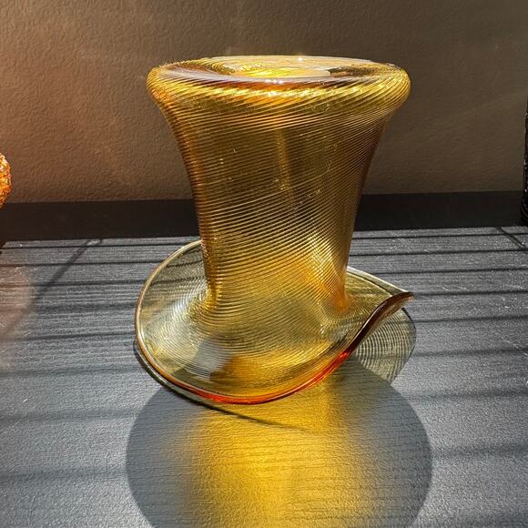 Vintage Amber Glass Hat Vase Hand Blown w/ Pontil Mark Spiral Pattern