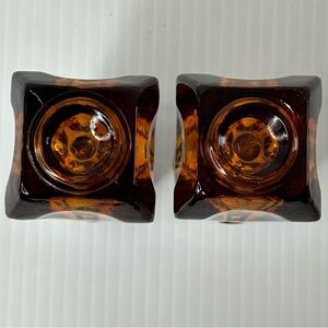 Beautiful vintage amber glass salt and pepper shakers. The salt screw on cap does have corrosion (very normal because of the salt) as photographed but otherwise in very good condition, no chips or cracks. Measured approximately 4.25” tall and 1.75” wide.
