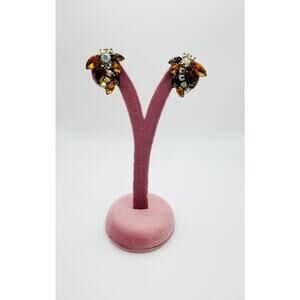 Add a touch of golden glamour to your look with these sparkling vintage clip-on earrings. Featuring rich amber marquise rhinestones accented by iridescent aurora borealis crystals, this pair dazzles with mid-century charm.