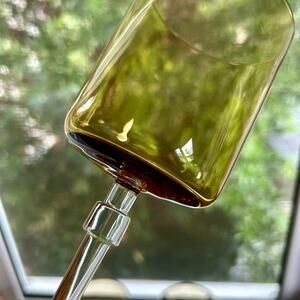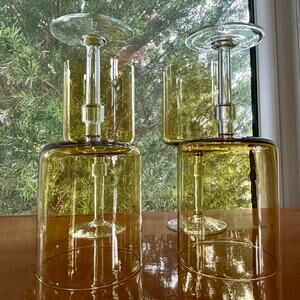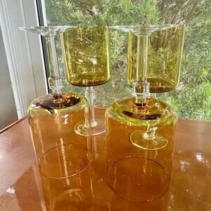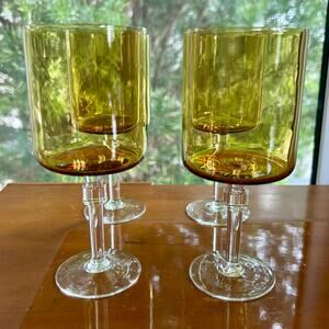 Set of 4 vintage amber stemmed glasses featuring a striking cylindrical bowl and clear pedestal base. Each goblet measures approximately 6.75 inches in height and 2.75 inches in diameter. The unique stem design features a modern geometric ring detail, giving the glasses a sculptural, mid-century aesthetic. Perfect for wine, cocktails, or display in a retro barware collection. In excellent vintage condition with minimal signs of wear.